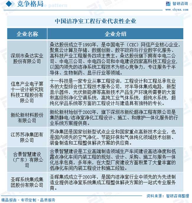 超潔凈環(huán)境控制又融合了風險評估、生產(chǎn)認證的概念和程序,加之潔凈技術(shù)跨行業(yè)、跨專業(yè)、跨學科的特點,使得潔凈室工程的難度和復(fù)雜性增加。因此對于潔凈室工程行業(yè)來說,優(yōu)化設(shè)計、現(xiàn)場施工環(huán)境的協(xié)調(diào)與管控、工程相關(guān)技術(shù)細節(jié)的經(jīng)驗積累,對客戶需求的理解和實現(xiàn),以及對設(shè)計變更的準備和響應(yīng)程度等都是衡量潔凈室工程企業(yè)競爭能力的重要指標。?目前,我國潔凈室工程行業(yè)競爭較為激烈,企業(yè)數(shù)量較多。其中,桑達股份、十一科技、蘇凈集團、新綸新材、柏誠股份、亞翔集成等設(shè)計研究院或建設(shè)承包企業(yè)在降低建造成本、提高潔凈室的穩(wěn)定性等方面占據(jù)優(yōu)勢,能提供高端潔凈室系統(tǒng)集成解決方案,位居行業(yè)領(lǐng)先地位。同時,行業(yè)內(nèi)還存在大量規(guī)模較小、技術(shù)水平與綜合解決方案能力有限的潔凈室工程企業(yè),普遍集中在對潔凈等級要求不高的低端市場。