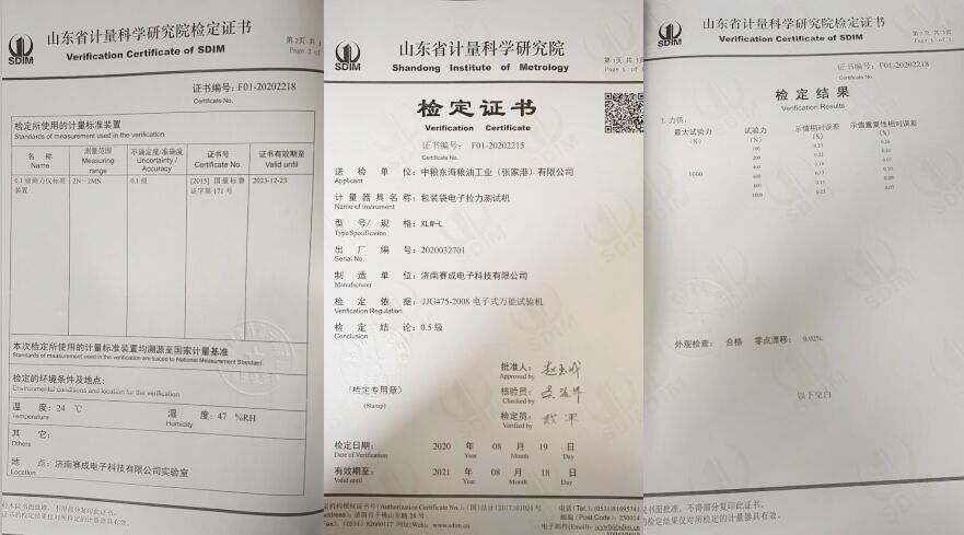 為了更好的交付這批設(shè)備,確保設(shè)備測(cè)試數(shù)據(jù)的準(zhǔn)確性,濟(jì)南賽成儀器向山東省計(jì)量科學(xué)研究院提出了檢定申請(qǐng)。依據(jù)JJG475-2008電子式萬(wàn)能試驗(yàn)機(jī)的檢定規(guī)程,省計(jì)量院工作人員對(duì)XLW-L包裝袋電子拉力試驗(yàn)機(jī)的精度和誤差等進(jìn)行了檢定,經(jīng)檢定結(jié)論達(dá)到0.5級(jí),檢定結(jié)果合格。2020年8月9日獲得山東省計(jì)量科學(xué)研究院頒發(fā)的檢定證書,獲得的這份檢定證書,進(jìn)一步證明了濟(jì)南賽成儀器符合預(yù)定要求和質(zhì)量要求,測(cè)量結(jié)果準(zhǔn)確,儀器持續(xù)可靠,性能穩(wěn)定。
